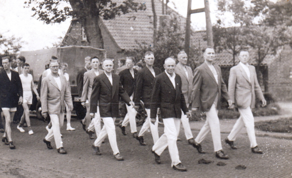 Eine Abordnung des TuS Oestringen in einem Festumzug Anfang der fünfziger Jahre. Zweiter von rechts Johann Gembler Bilder: Magrit Rottmann