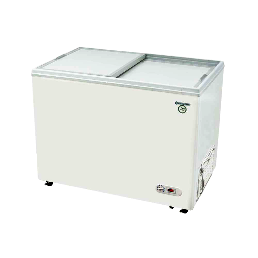 Die robuste 300 l Kühltruhe ist mit Schiebedeckel versehen.